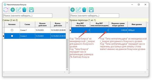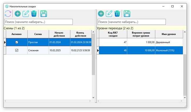 Накопительная скидка (или накопительный бонус) представляет собой «Схему» (в левой части формы), которая определяет перечень «Уровней перехода» от одной скидки (или бонуса) к другой в зависимости от накопленной суммы собственных потрат владельца.