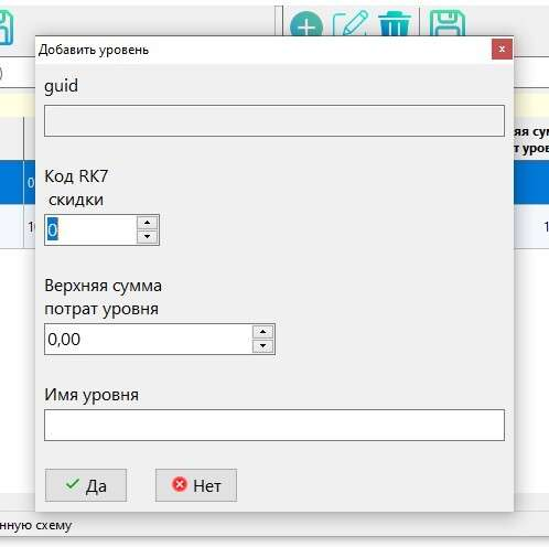 Всякий раз при применении карты к заказу происходит проверка, назначена ли карте какая-либо схема накопительных скидок (или бонусов). Если схема назначена, то проверяется сумма собственных потрат владельца и в зависимости от нее карте назначается скидка (или бонус), которая задана в поле «Код RK7 скидки» соответствующего уровня (в правой части формы).
