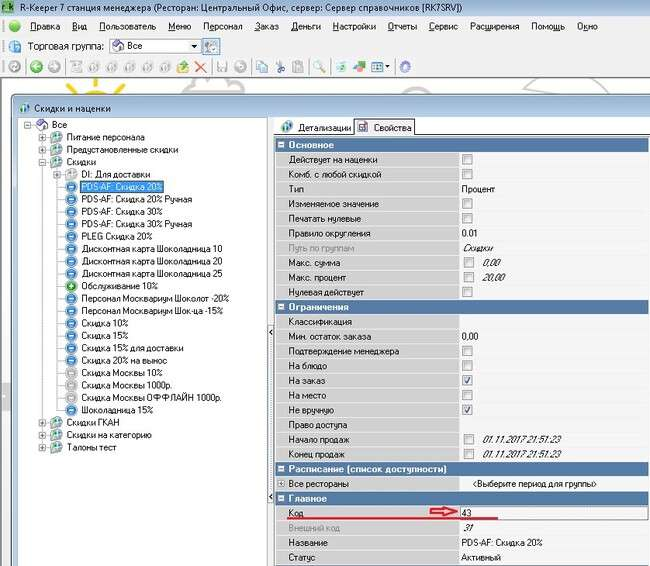 Поле «Код RK7 скидки» должно соответствовать значению поля «Код» справочника «Скидки и наценки» из менеджерского приложения r_keeper (см. скриншот):