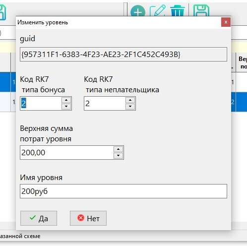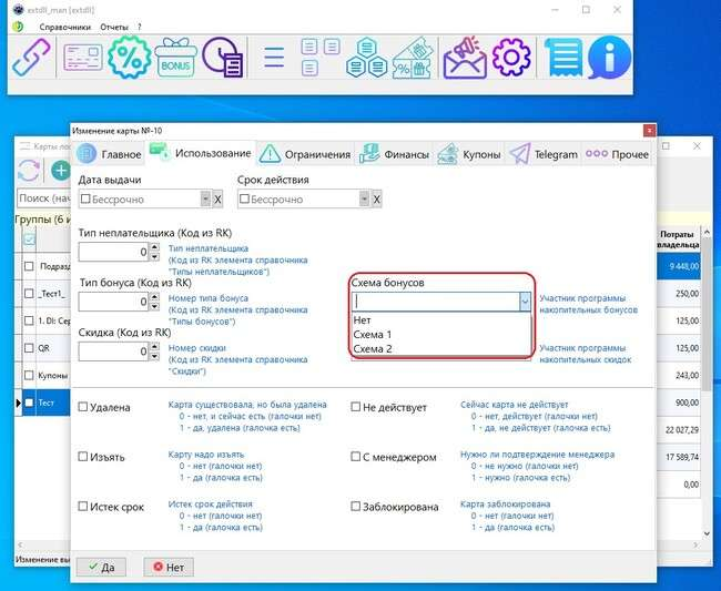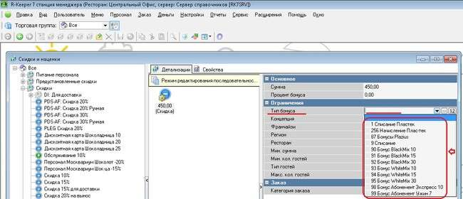 После того как бонусы и детализации созданы, в приложении extdll_man в справочнике «Карты» для нужной карты (или в справочнике «Накопительные бонусы» для уровня перехода бонусов) в поле «Код RK7 бонуса» указать цифровое значение из поля Кода справочника «Типы бонусов» из менеджерской r_keeper, которое и будет передано в кассу, при применении карты к заказу. А касса, получив этот код типа бонуса из карты, уже осуществит применение конкретной детализации этого бонуса с учетом всех заданных в r_keeper условий для возможности применение этой детализации бонуса к заказу.