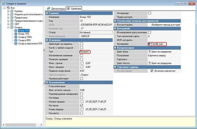 Размер скидки, условия ее применения – все это касса возьмет именно из этого справочка. Карта лишь передает информацию (значение поля «Код») кассе, какую именно скидку или бонус надо попытаться применить к заказу.