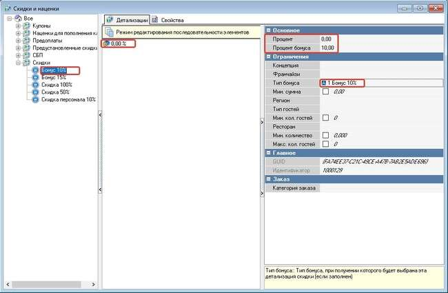 Создаем детализацию бонуса накопления 10% и указываем для нее в свойстве «Тип бонуса» созданный выше тип бонуса.