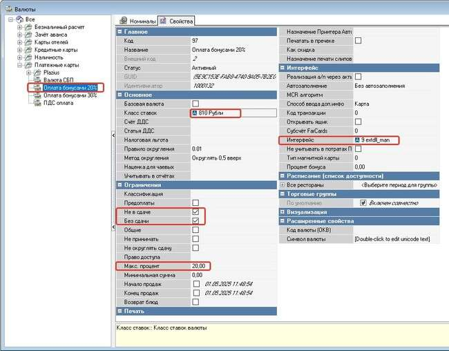 - «Код типа неплательщика» из менеджерской r_keeper, которому соответствует валюта с установленным значением в свойстве «Макс. Процент» – 30%.