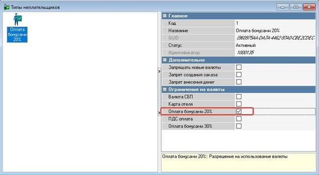 В справочнике «Типы неплательщиков» создаем элемент (на примере ниже – «Оплата бонусами 20%) и указываем галочкой только одну валюту «Оплата бонусами 20%», которая и появится на кассе в режиме оплаты заказа, если к столу была применена карта лояльности, бонусный уровень которой соответствовал уровню «Бонусный уровень 1».
