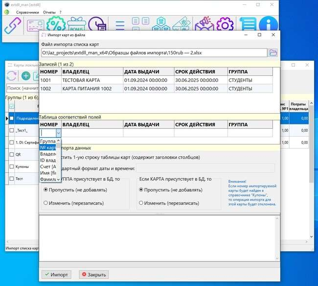 Выполнение импорта справочника карт из файла с произвольным порядком следования полей (столбцов) с данными осуществляется следующим образом: