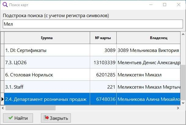 - Поиск и выдача записей путем точного совпадения заданной подстроки символов со значением поля "№ карты"