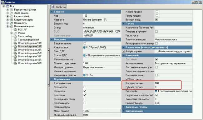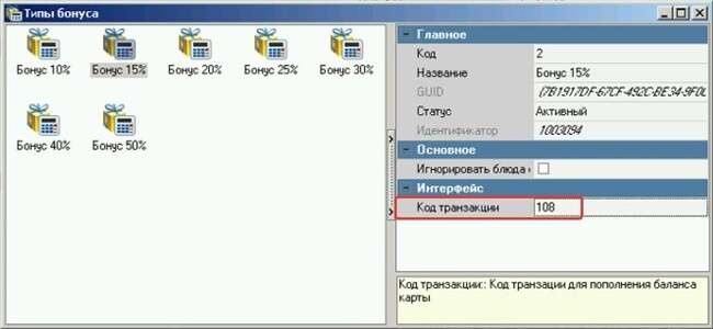 Свойства типа бонуса: красным выделен параметр Код транзакции