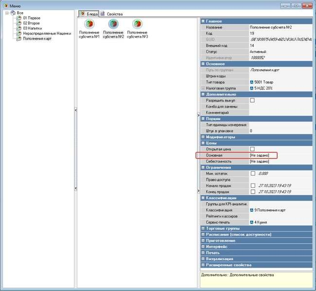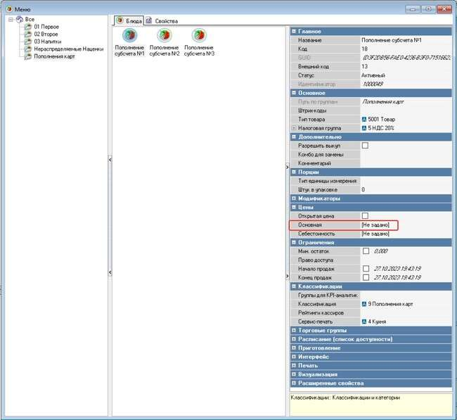 Создать блюда для каждого субсчета, которые будут фигурировать в фискальном чеке при выполнении операции пополнения нужного субсчета карты на кассе.