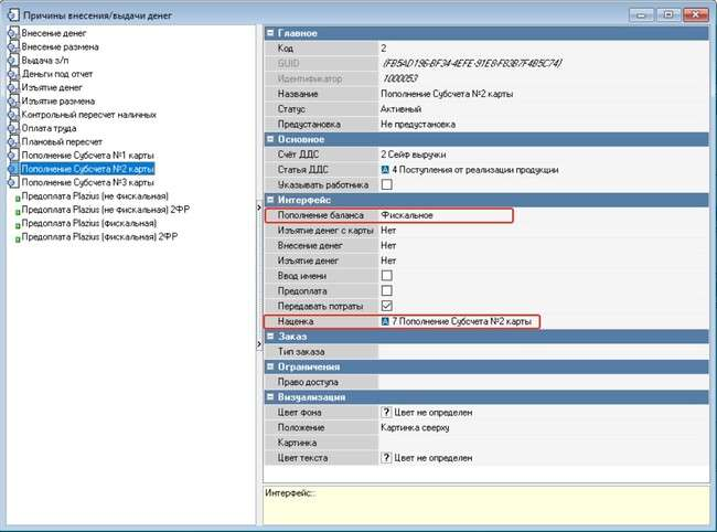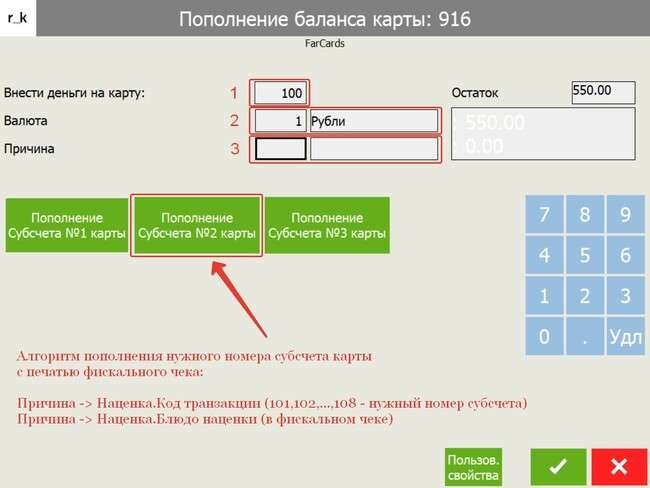 Пример настройки фискального пополнения разных субсчетов карты штатной операцией пополнения с кассы r_keeper