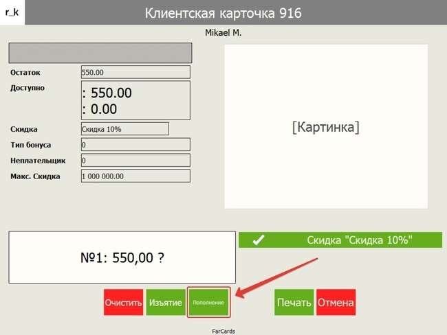 Выполнение штатной операции пополнения необходимого субсчета карты на кассе r_keeper