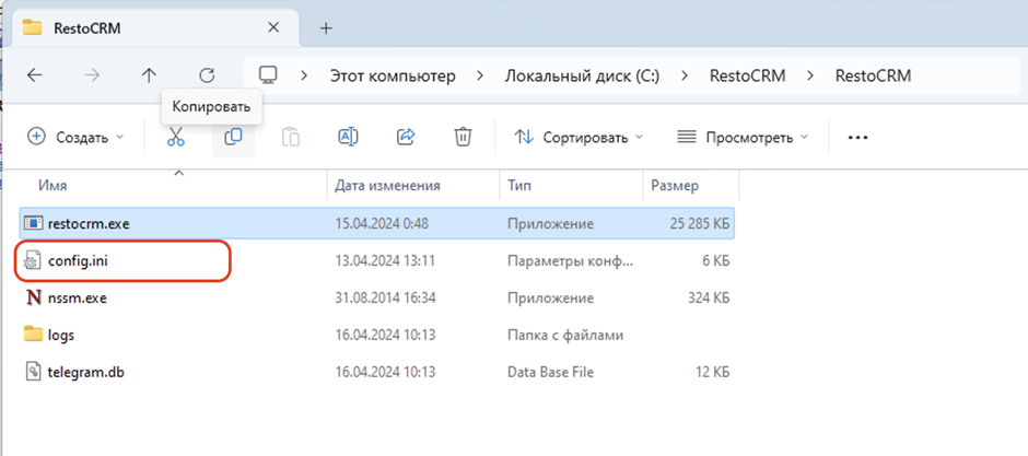 Настройте конфигурационный файл config.ini. Файл config.ini расположен в папке где находится исполняемый файл RESTOCRM.exe.