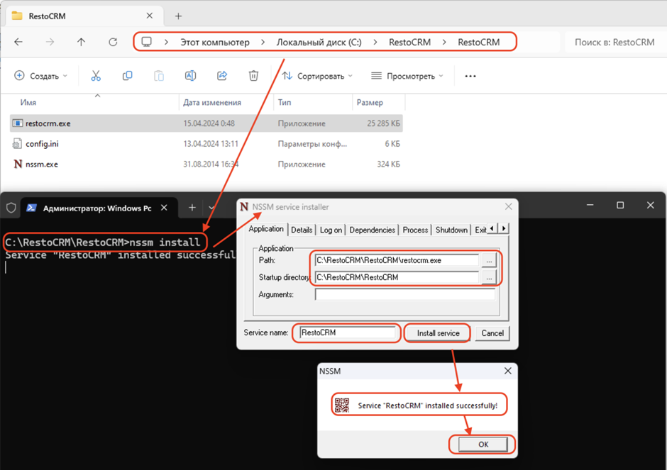 - Для этого необходимо скопировать nssm.exe в папку где находится сервис RESTOCRM.exe.