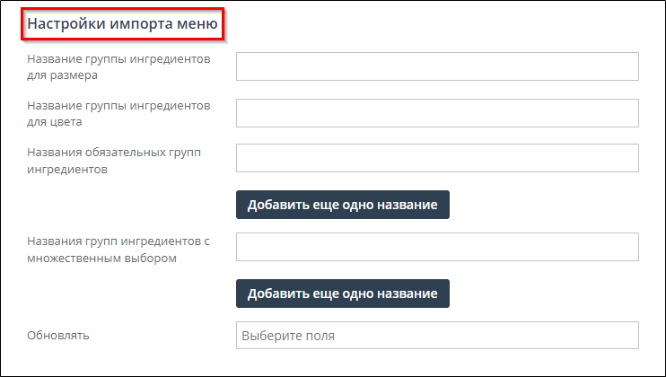 Названия групп ингредиентов с множественным выбором – указываются группы ингредиентов, которые выбираются при оформлении заказа. То есть, возможно выбрать несколько ингредиентов.