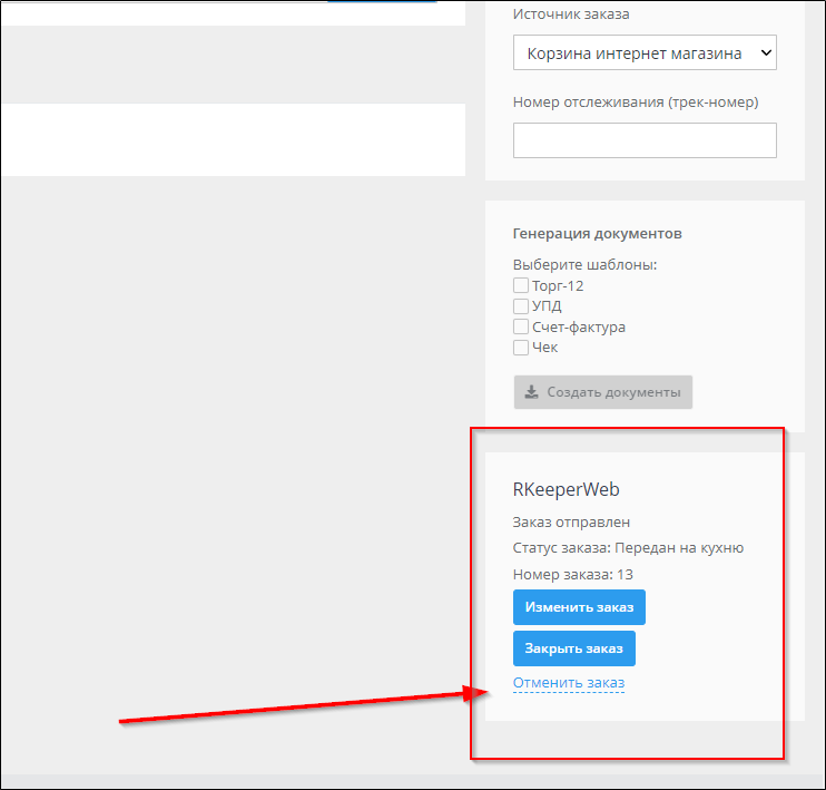 Чтобы отменить заказ на стороне магазина, необходимо выбрать команду Отменить заказ в заказе в блоке справа (здесь же находится управление обработкой заказа)