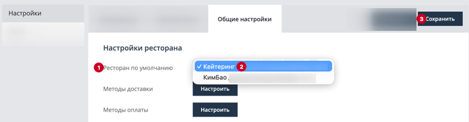 В блоке Ресторан по умолчанию необходимо выбрать ресторан, с которого будет загружаться меню.