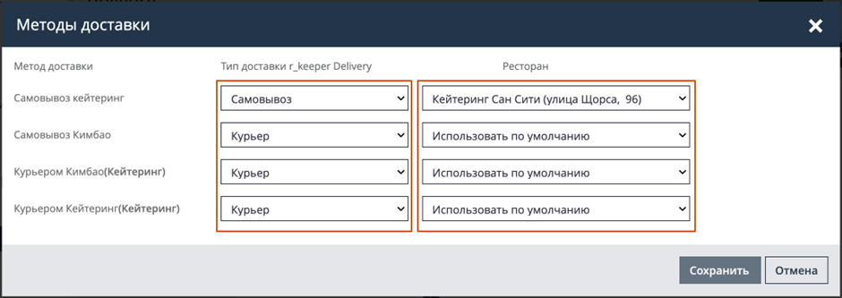 После выбора ресторана по умолчанию необходимо сопоставить методы доставки.