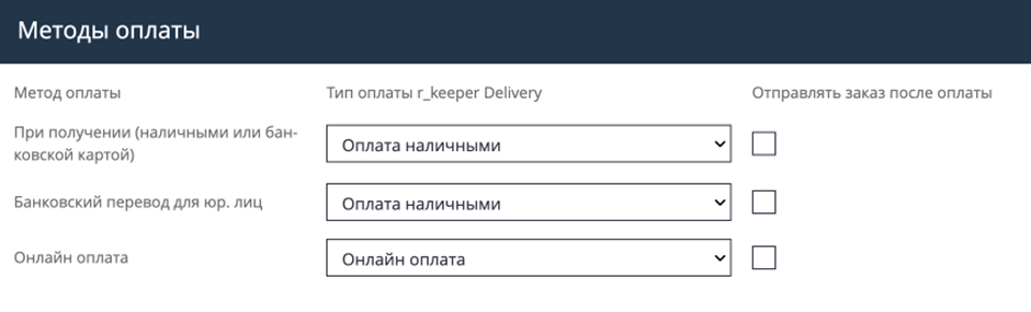 - Сопоставьте методы оплаты сайта и мобильного приложения с соответствующими типами оплат в r_keeper Delivery.