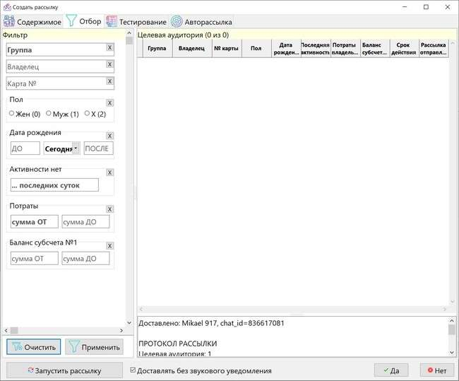Независимо от значений полей в фильтре всегда проверяются обязательные условия отбора целевой аудитории, указанные в разделе Обязательные условия доставки рассылки.