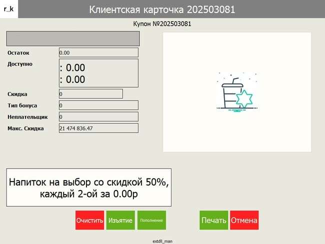 На этой форме внизу слева отображается содержимое поля Инфо на экран, в котором для кассира кратко описана схема работы купона.