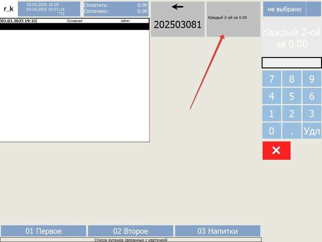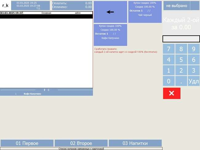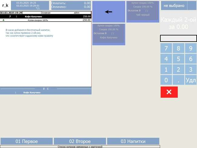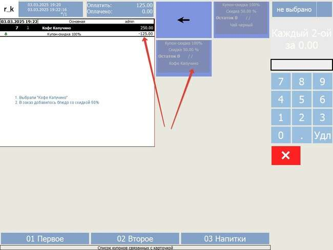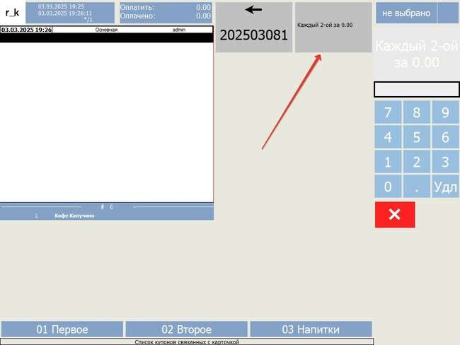 Теперь рассмотрим как выглядит процесс применения такого купона в интерфейсе кассира r_keeper.