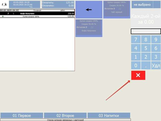 Выходим из режима работы с купоном по красной кнопке с крестиком.