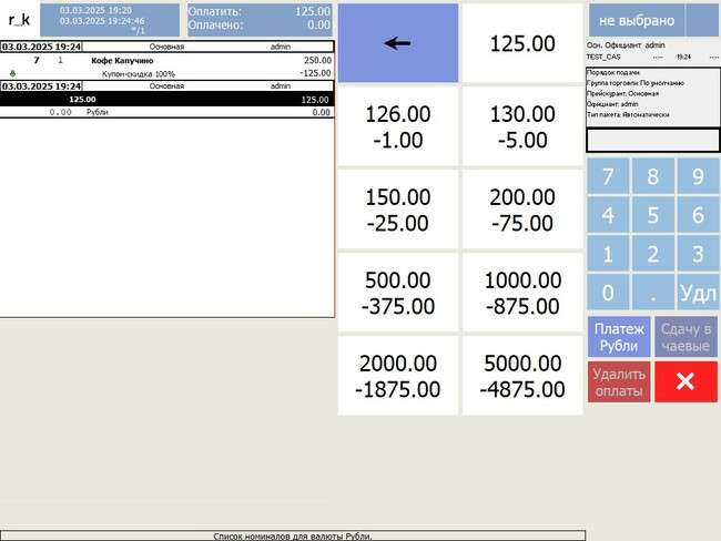 Дальнейшая работа с заказом осуществляется обычным штатным образом. Можно добавить прочие блюда, или удалить купонные элементы (они удалятся совместно с ассоциированными с ними скидками).