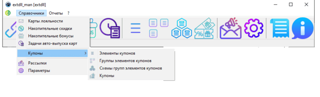 Для работы с купонной механикой на главной форме приложения extdll_man представлена панель инструментов Купоны