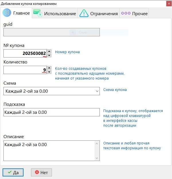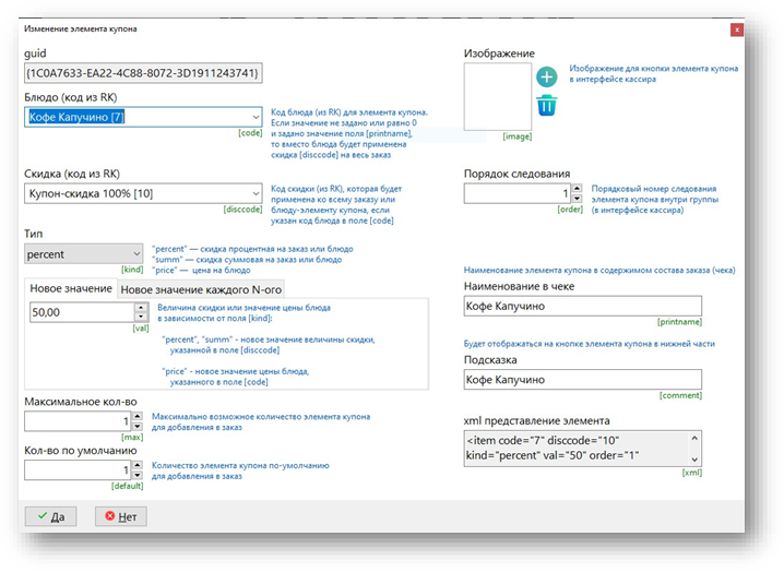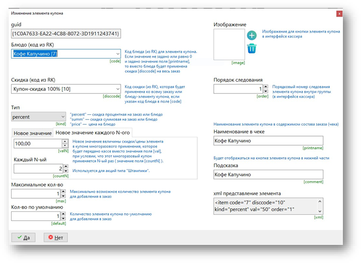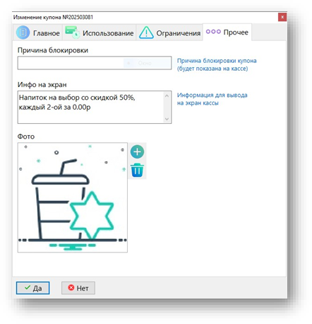 Для информирования кассира о сути предъявленного купона пишем в поле «Инфо на экран» краткое описание его схемы работы, а в поле Фото добавляем пояснительное изображение.