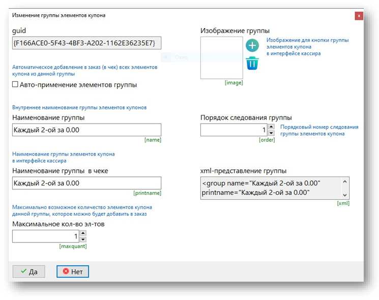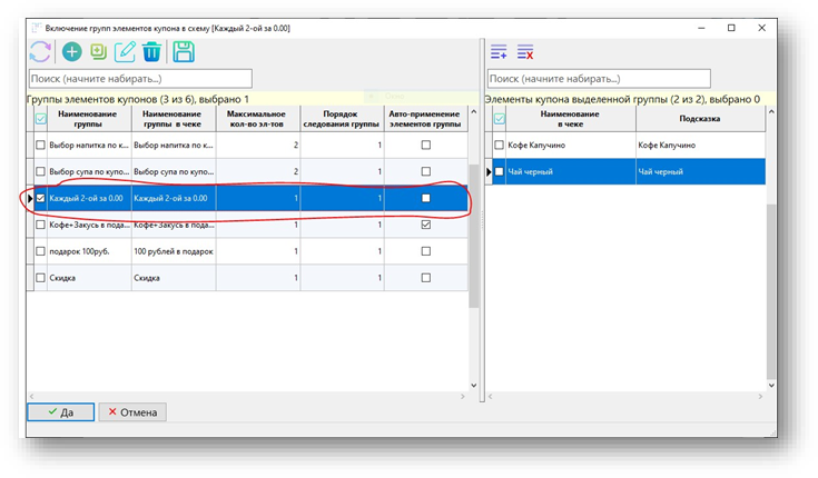 Для обеспечения выбора напитка на кассе вручную кассиром галочку Автоприменение элементов группы не ставим.