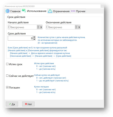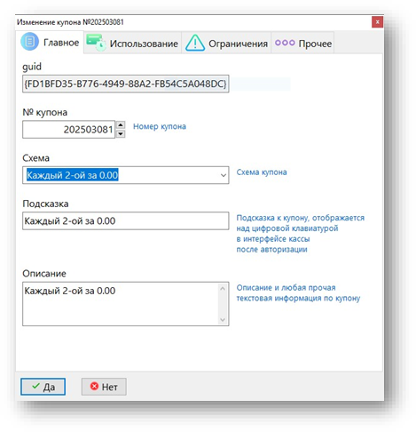 Сохраняем, нажав кнопку Да. На этом создание первого купона завершено.
