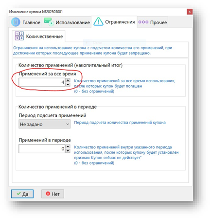 Для ограничения количества напитков, которое можно получить по купону, на вкладке Ограничения задаем количество применений купона за все время: 4