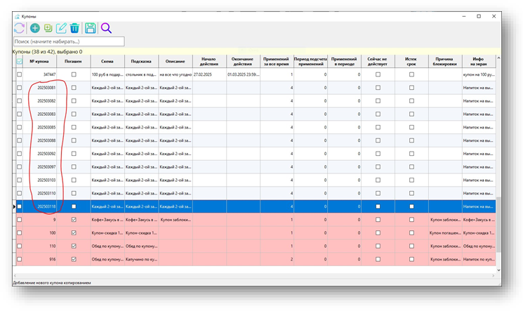 Чтобы создать оставшиеся купоны установим курсор на созданный нами на предыдущем шаге купон и воспользуемся кнопкой Добавить купон копированием