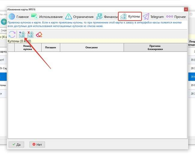 Перейдем в справочник Карты и откроем необходимую нам карту. Далее перейдем на вкладку Купоны.