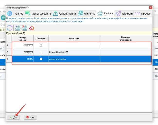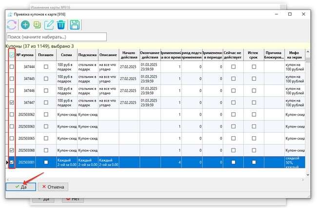 Появляется справочник Купоны, где необходимо выбрать, отметив галочкой в первом левом столбце, нужный купон или несколько купонов, которые будут связаны с картой лояльности. После завершения выбора нажать кнопку «Да» в нижней части формы. Выбранные купоны добавятся в табличную часть вкладки «Купоны» формы свойств карты лояльности.