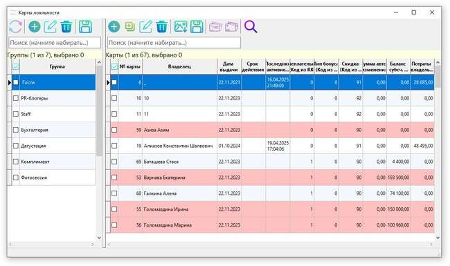 Карты лояльности в обязательном порядке должны быть внутри какой-либо группы. Работа с группами осуществляется в левой части формы посредством функциональных кнопок на панели инструментов над таблицей групп, либо контекстным меню, доступным правым кликом мыши по таблице групп.