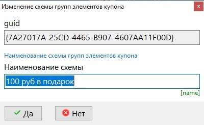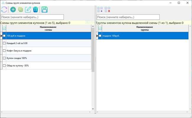 Интеграции с r_keeper Системы лояльности extdll_man Купоны Current: Справочник «Схемы групп элементов купонов» Справочник «Схемы групп элементов купонов» Последнее изменение статьи 06.11.2025 17:54 Данный справочник предназначен для работы со схемами групп (левая часть формы) и с вхождениями в них групп элементов (правая часть формы). На скриншоте ниже показаны свойства уже созданной ранее схемы. ×