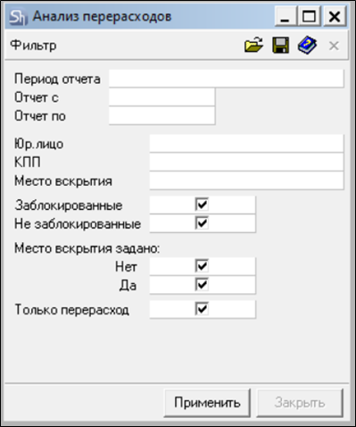 Если выставить все флаги, а поля даты, Юр. лицо, КПП, место вскрытия оставить незаполненными, то расход будет выведен по всему списку вскрытых марок.