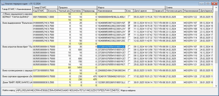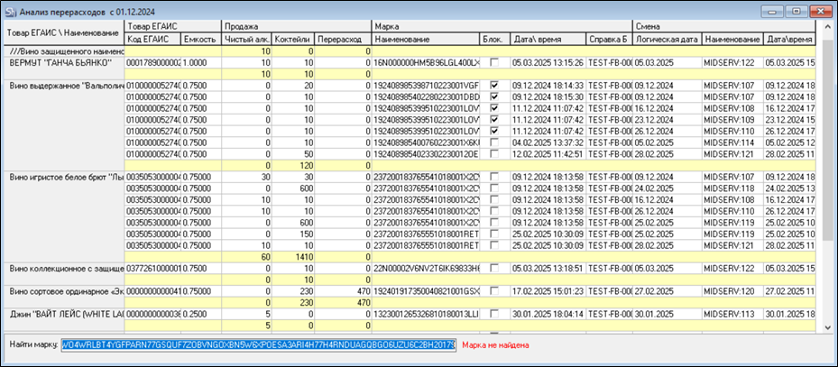 Для поиска марки в отчете «Анализ перерасходов» добавлена область чтения марок. Для поиска марки, позиционируйте курсор в поле «Найти марку». Отсканируйте марку или вставьте в поле скопированную последовательность. Если марка найдена, то рядом с полем «Найти марку» будет выведено сообщение «Марка найдена». В окне отчета будет выделена найденная марка.