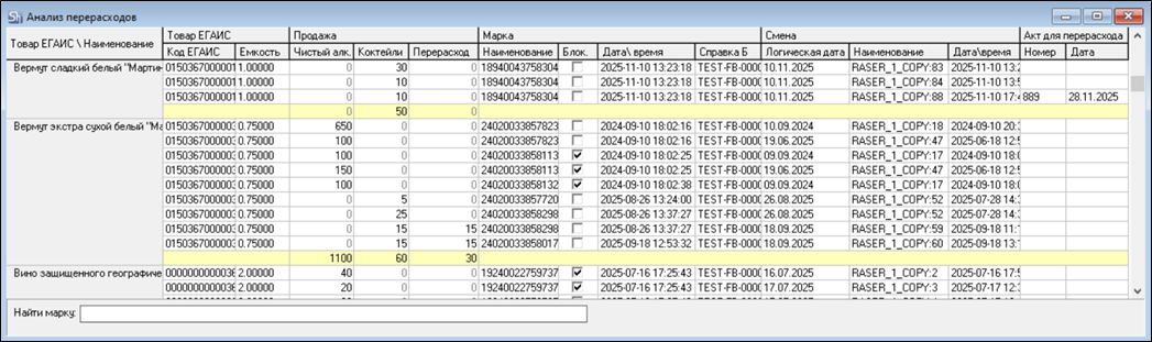 Акт для перерасхода (Номер, Дата) - номер и дата связанного Акта списания (порционный) созданного из отчета, в котором произошел подбор марок для компенсации перерасхода другими марками. Если Акт выделен синим цветом, значит он не проведен в ЕГАИС. Пока Акт не проведется в ЕГАИС перерасход по марке в отчете не будет скомпенсирован.