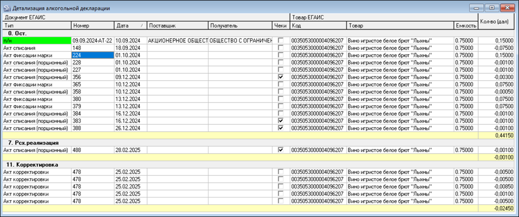 В отчете будет выведен список документов ЕГАИС организовавших оборот для выделенной строки отчета, сгруппированный по типам движения. Группировка соответствует колонкам из Части 1 Алкогольной декларации (ЕГАИС).