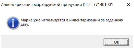 Инвентаризацию можно проводить отдельно по кодам видов алкогольной продукции и за один день могут быть заведены несколько документов инвентаризации. В системе осуществляется проверка, что за одну дату в разных документах инвентаризации не используется одинаковая марка. Если отсканированная марка находится в другом документе инвентаризации за заданную дату, выйдет сообщение «Марка уже используется в инвентаризации за заданную дату» и отсканированная марка не будет добавлена в документ инвентаризации.