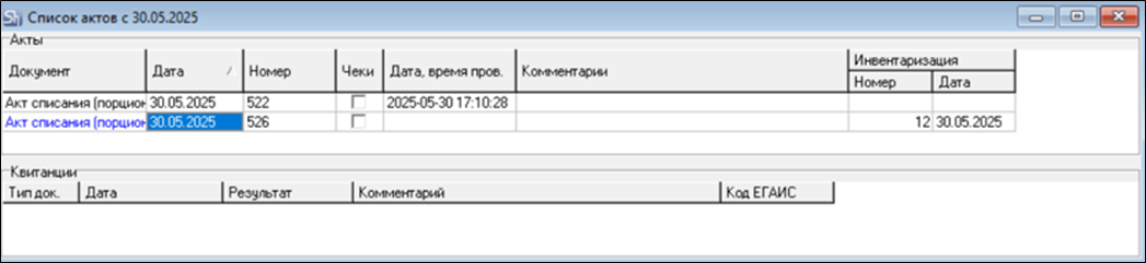 Информацию о принятии или отклонении акта списания (порционного) можно посмотреть в пункте «ЕГАИС» – «Акты» главного пункта меню «Сервис».