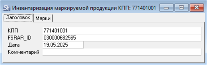 Поля КПП и FSRAR_ID будут заполнены автоматически из фильтра списка документов инвентаризаций.