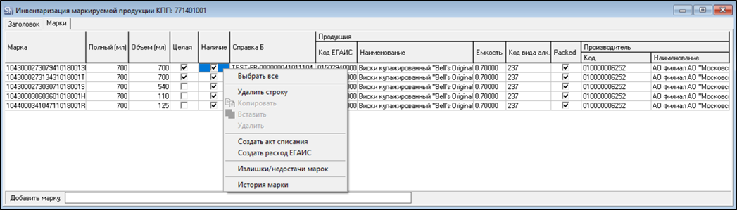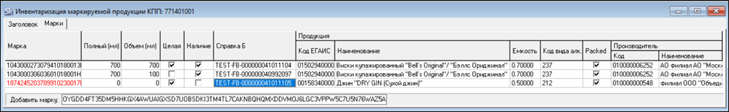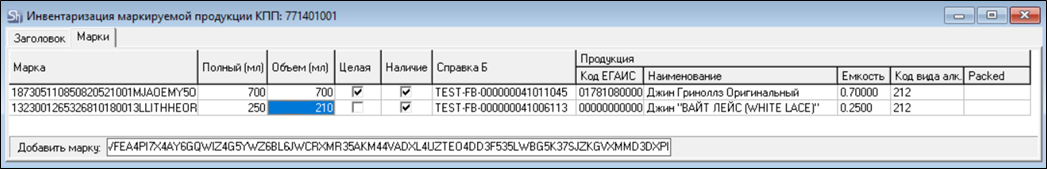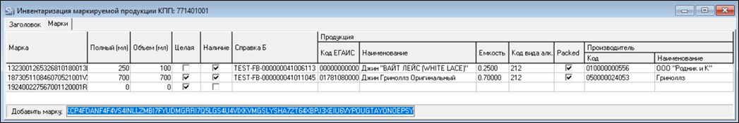 Инвентаризация маркируемой алкогольной продукции. Закладка «Марки»