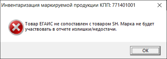 При сканировании Целой марки, для которой товар ЕГАИС не сопоставлен с товаром SH Pro, система выдаст предупреждение «Товар ЕГАИС не сопоставлен с товаром SH. Марка не будет участвовать в отчете излишки/недостачи», так как отчет «Излишки/недостачи марок» строится по товарам r_k SH Pro. Но марка будет добавлена в список инвентаризации. При сопоставлении товара ЕГАИС с товаром SH Pro цвет марки с красного поменяется на черный.