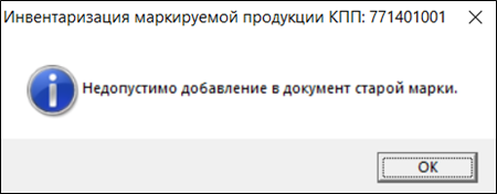 При сканировании марки, которая находится в списке Вскрытых марок с флагом «Старая» выйдет сообщение «Недопустимо добавление в документ старой марки».