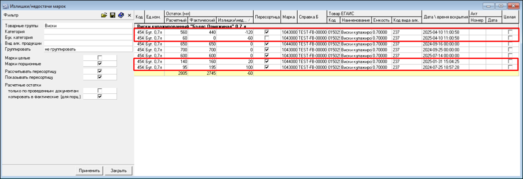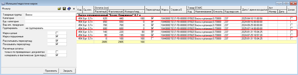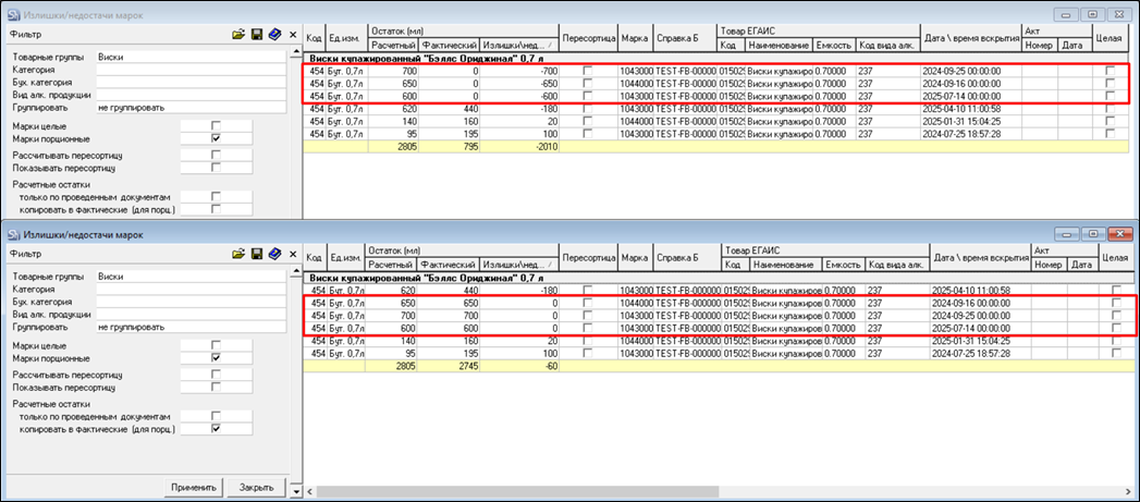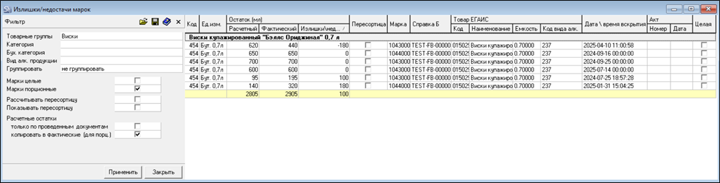 После сохранения Акта списания (порционный) в отчете Излишки/недостачи марок произойдет перерасчет расчетных остатков, при условии, что акт сформируется датой документа Инвентаризация маркируемой продукции.
