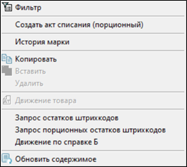 Для создания Акта списания (порционный) из отчета «Излишки/недостачи марок» выделите необходимые позиции, удерживая клавишу [Ctrl] и воспользуйтесь командой контекстного меню «Создать акт списания(порционный)». Для выделения всех марок из отчета воспользуйтесь сочетанием клавиш [Ctrl] + [A].