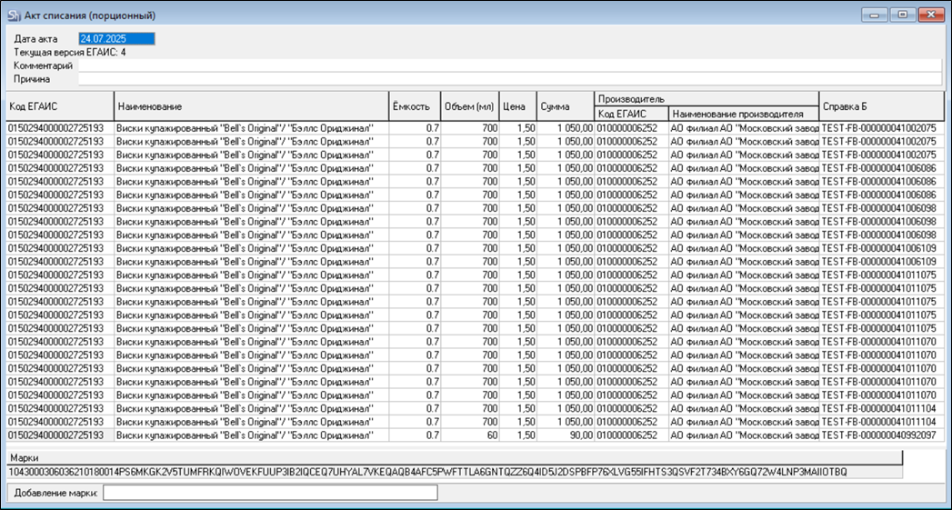 Система автоматически откроет окно создания документа Акта списания (порционный) с уже заполненными значениями номенклатуры, ее свойствами, справкой Б и марками. Для каждой марки товар добавляется отдельной строкой.