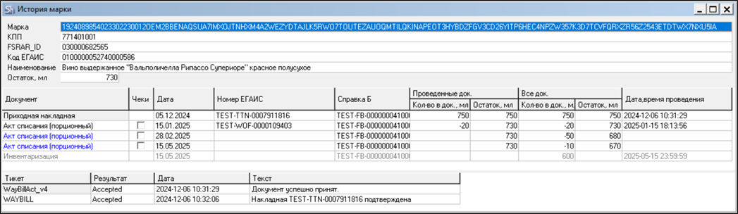 Также реализован функционал, позволяющий просмотреть историю выбранной марки в любых актах и документах ЕГАИС.